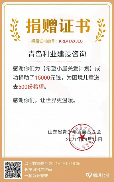 日前,公司積極響應(yīng)共青團(tuán)山東省委、山東省青年聯(lián)合會(huì)、山東省青少年發(fā)展基金會(huì)號(hào)召,全員踴躍參加“希望小屋”兒童關(guān)愛(ài)活動(dòng),99公益日期間共募集善款15000元,市南團(tuán)區(qū)委領(lǐng)導(dǎo)一行專程走訪公司,授予感謝信。