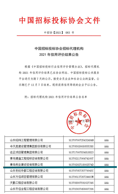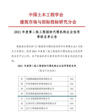 近日,兩項(xiàng)國家級(jí)協(xié)會(huì)信用等級(jí)評(píng)價(jià)結(jié)果公布,分別是中國招標(biāo)投標(biāo)協(xié)會(huì)招標(biāo)代理機(jī)構(gòu)信用評(píng)價(jià)、中國土木工程學(xué)會(huì)建筑市場(chǎng)與招投標(biāo)研究分會(huì)工程招標(biāo)代理企業(yè)信用等級(jí)評(píng)價(jià),公司均獲評(píng)最高等級(jí)AAA級(jí)。