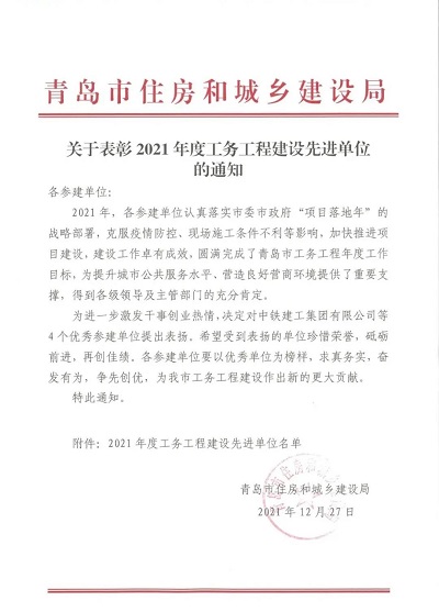 近日,青島市住房和城鄉(xiāng)建設(shè)局對(duì)2021年認(rèn)真落實(shí)青島市委市政府“項(xiàng)目落地年”戰(zhàn)略部署的優(yōu)秀工務(wù)工程參建單位進(jìn)行了表彰。公司中波項(xiàng)目團(tuán)隊(duì)在中波發(fā)射臺(tái)遷建工程代建項(xiàng)目中以優(yōu)質(zhì)服務(wù)贏得高度認(rèn)可,公司被授予“2021年度工務(wù)工程建設(shè)先進(jìn)單位”榮譽(yù)稱號(hào)。